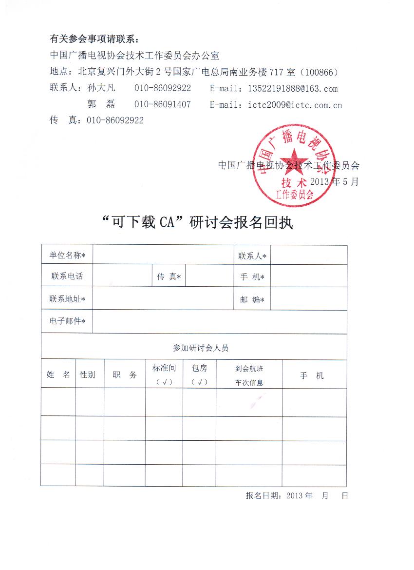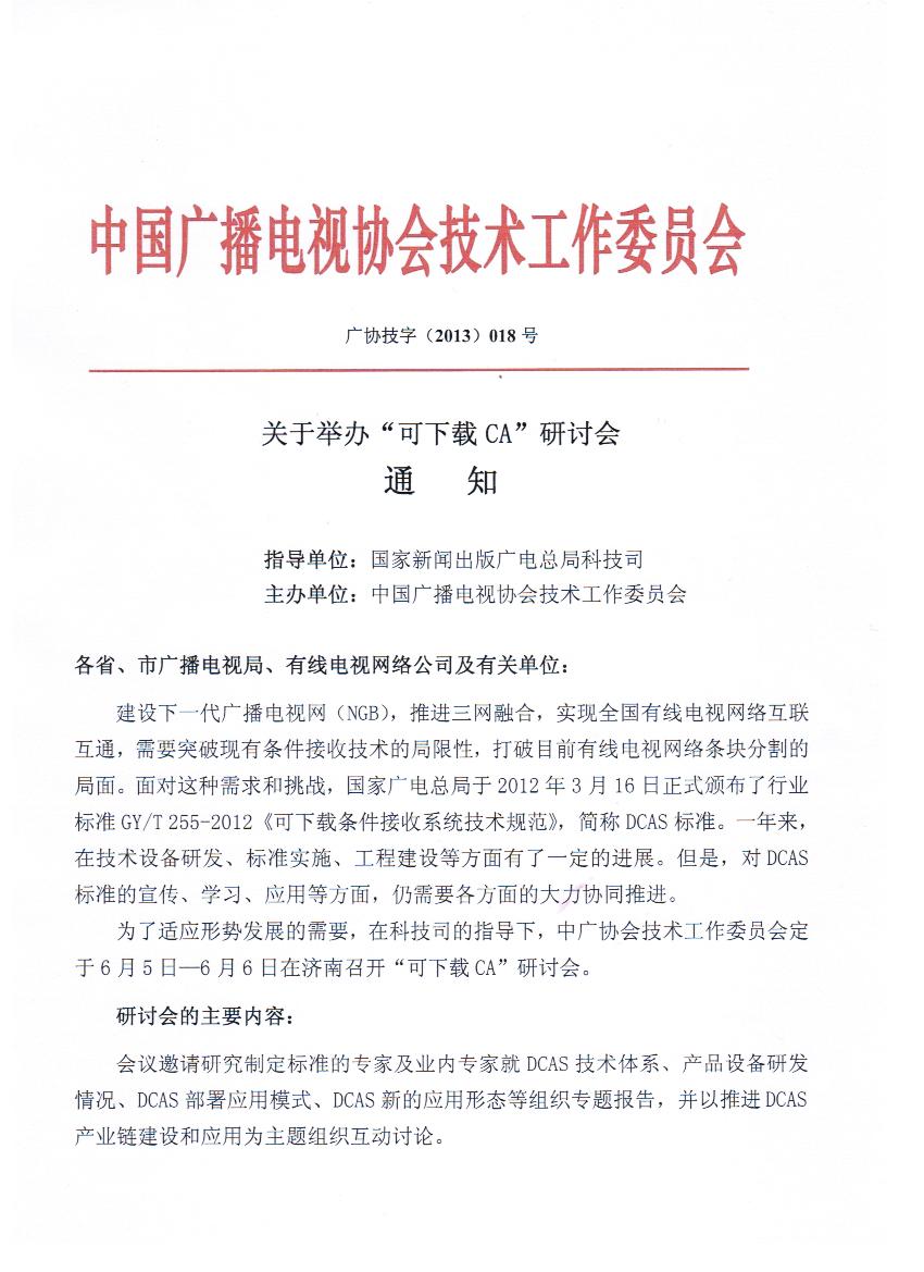 為了進(jìn)一步推廣落實(shí)下載CA,2013年6月5日-6日,在總局科技司支持下,中國(guó)廣播電視技術(shù)協(xié)會(huì)技術(shù)工作委員會(huì)將在濟(jì)南召開“可下載CA研討會(huì)”,在本次會(huì)議上,將重點(diǎn)就DCAS技術(shù)體系、產(chǎn)品設(shè)備研發(fā)情況、DCAS部署應(yīng)用模式、DCAS向多終端的新的應(yīng)用形態(tài)等組織專題報(bào)告,并以推進(jìn)DCAS產(chǎn)業(yè)鏈建設(shè)和應(yīng)用為主題組織互動(dòng)討論,敬請(qǐng)關(guān)注。