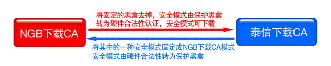 目前,泰信下載CA的接口規(guī)范已經(jīng)符合NGB下載CA,如果總局動(dòng)員各種資源,強(qiáng)力推動(dòng)符合NGB下載CA規(guī)范的芯片產(chǎn)業(yè)成熟,屆時(shí),泰信下載CA將不作任何改動(dòng)就可以完全滿足NGB下載CA的規(guī)范要求,這相當(dāng)于將泰信下載CA的一種安全模式固定為符合NGB的黑盒安全模式。NGB下載CA和泰信下載CA之間的關(guān)系如下: