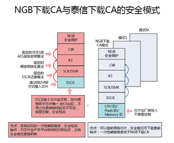 上圖中,終端芯片中的Chip IDESK根密鑰都是與硬件關聯的標示,二者都是與硬件關聯,且不可更改,具有等同的作用。所不同的是ChipID沒有包裹黑盒,是可見的,以此為安全基礎芯片不需要定制;ESK按照NGB下載CA的要求是不可見的,以此為安全基礎芯片需要定制。