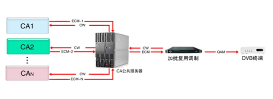 具體措施是,將多個CA服務器與一臺公共的匯聚服務器相連,與匯聚服務器連接的CA數量可不受限制,然后這臺公共的匯聚服務器再以用一個CA的身份與加擾機相連,即使與匯聚服務器連接的CA很多,對于加擾機而言,仍然是一個CA連接。這樣,引入下載CA 的數量就不再受到限制,運營商可以借助CA公司之間的競爭提升運營能力。