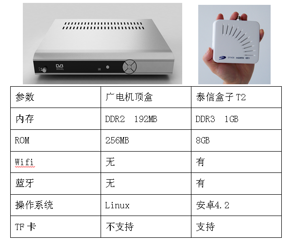 自2013年各種網絡盒子紛紛面市,盒子體積變得越來越小,性能越來越強,與廣電機頂盒性能相比竟然相差十倍多。見下圖: