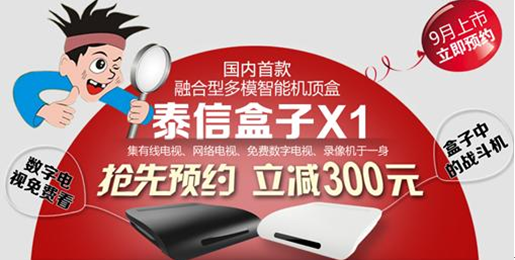 泰信盒子X1伴隨著國(guó)慶的來(lái)臨即將與消費(fèi)者見面!據(jù)了解,這將是國(guó)內(nèi)首款融合型多模智能機(jī)頂盒,搭載了基于安卓4.2系統(tǒng)深度優(yōu)化的DTVOS數(shù)字電視操作系統(tǒng),將有線電視、網(wǎng)絡(luò)電視、地面數(shù)字電視接收、錄像機(jī)等多種功能集于一身。該盒子9月20日起在淘寶官方店(http://shop112060586.taobao.com/ )正式預(yù)售,商家讓利最高直降300!