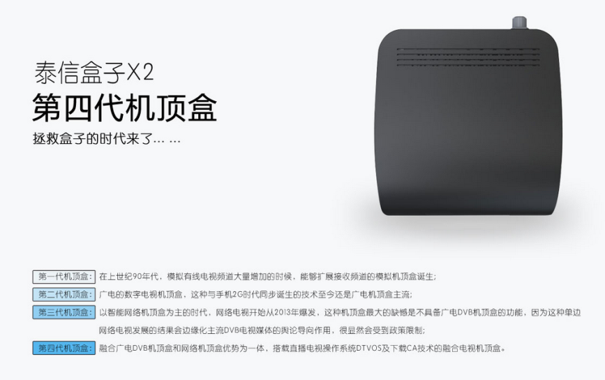 第四代機(jī)頂盒來(lái)了,全球首款四核有線電視盒—泰信盒子X2于12月正式上市!提前通過(guò)泰信電子官方網(wǎng)站客服預(yù)定將有豪禮相贈(zèng)!抓緊行動(dòng)吧!