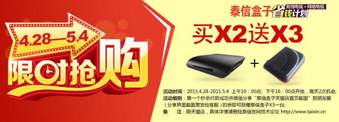 此次五一特惠,泰信電子特將被評為“2014年度十大最受喜愛的電視盒子”的泰信盒子X2,在泰信盒子官方天貓店進(jìn)行限時搶購,買泰信盒子X2,贏免單新品!活動日期是4月28日至5月4日,活動規(guī)則請登錄泰信電子技術(shù)論壇查閱。同時,從泰信官網(wǎng)商城下單更有驚喜。