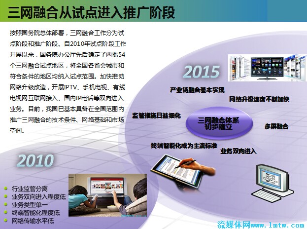 2010年的時候,電信和廣電雖然很少局部有了三網(wǎng)融合的業(yè)務(wù),但是基本上兩個行業(yè)還是封閉在兩個體系內(nèi)運(yùn)營的,這是2010年的時候,當(dāng)時流媒體網(wǎng)的會議大家都可以看得出來,當(dāng)時參加流媒體會議廣電參加的很少,但是今天參加這種會議的人就很多了,也就是網(wǎng)絡(luò)的人比2010年的時候大大增加了。
