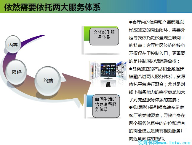 怎么保?廣電運(yùn)營商在出自己的電視機(jī),廣電有限運(yùn)營商出自己的電視機(jī),建院線。電信運(yùn)營商也在探索是不是出自己品牌的終端或自己品牌的電視機(jī)?原來做內(nèi)容的現(xiàn)在做手機(jī)、電視,大家都在產(chǎn)業(yè)鏈上下游中串,是有錢燒得嗎?不是,有一個人講了一句話很有道理,他說“我用第三方的東西,可能用第三方的終端或者是操作系統(tǒng),我老是沒有辦法把我的有效期提升到最大,最后沒有辦法,為了讓我的用戶體驗最好,我只能從頭到尾自己做”。這句話是有道理的,其實(shí)打通了上下游以后,你才有能力給用戶提供差異化服務(wù),才有可能發(fā)覺你自己的1億用戶的主打業(yè)務(wù),這1億我指得不是注冊,是實(shí)實(shí)在在在黏性很強(qiáng)的,你才有可能發(fā)展。所以說走融合發(fā)展之路,是可能每個有實(shí)力的廠商,都沒有辦法回避的。