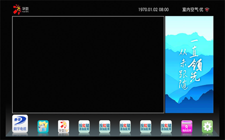 泰信盒子的UI界面凸顯有線電視的地位。當正確連接RF同軸線,插入智能卡并設置完畢后,將在UI界面中央顯示有線電視實時畫面,并在數秒后自動跳轉進有線電視全屏模式。