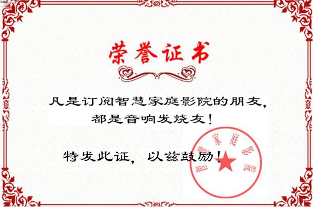 智慧家庭影院對(duì)發(fā)燒友的定義就是愛(ài)好音樂(lè)、追求生活品質(zhì)的人,當(dāng)然也包括正在閱讀此文的你。頒發(fā)證書(shū)如下: