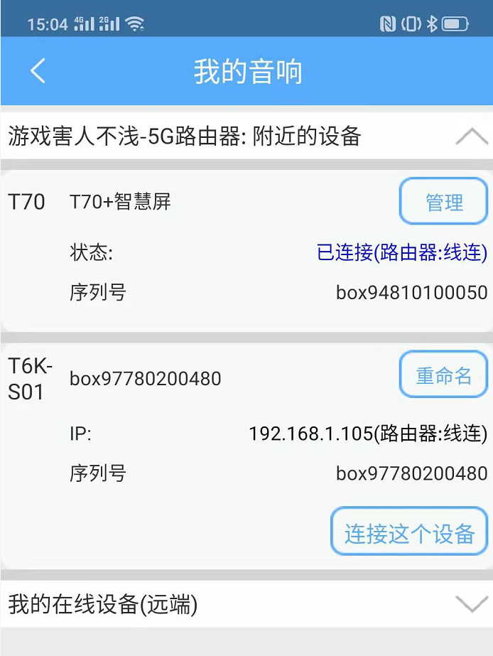 T70和手機(jī)連接相同的路由器,手機(jī)打開泰信智能家居APK,在”我的\我的設(shè)備”中,連接T70(我已將T70名稱改為“T70+智慧屏”)。