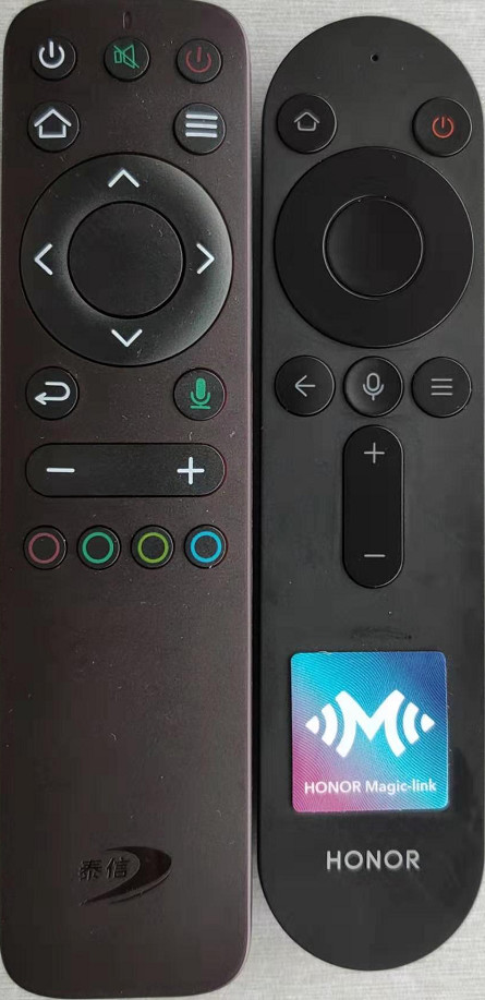 T70的遙控器和智慧屏遙控器差不多大。T70遙控器也是一個(gè)學(xué)習(xí)型紅外線遙控器,整個(gè)外殼是深紫紅色半透明,用于透射紅外線,可見其成本是很高的。T70遙控器白色的電源開關(guān)鍵用于遙控電視機(jī)電源,紅色的用于T70電源遙控,還有4個(gè)多功能顏色鍵。藍(lán)色的是藍(lán)牙/電視切換鍵,按一下進(jìn)入藍(lán)牙音箱,再按一下進(jìn)入電視模式。 智慧屏的藍(lán)牙遙控器延續(xù)了互聯(lián)網(wǎng)電視簡(jiǎn)潔的風(fēng)格。兩種藍(lán)牙語(yǔ)音識(shí)別率都比較高,操控比較順暢。