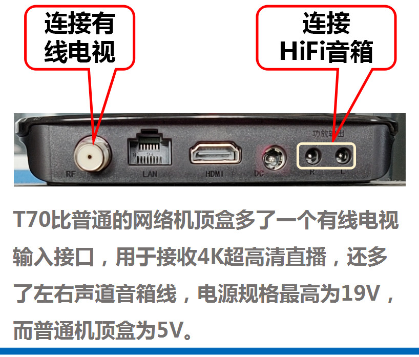 T70除多了兩個音箱線接口,其它的使用和普通機頂盒的使用方法相同。