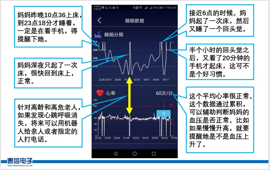 泰信還提供可與T70連接的“睡享健康”心振波傳感器,可以檢測睡眠時心臟跳動所發出的微弱心振動波。