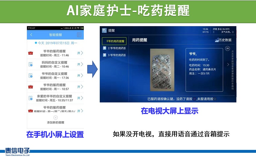 T70可以在老人看電視的時候提醒按時吃藥,即使關(guān)掉電視,使用外置音箱也會通過語音提醒老人。