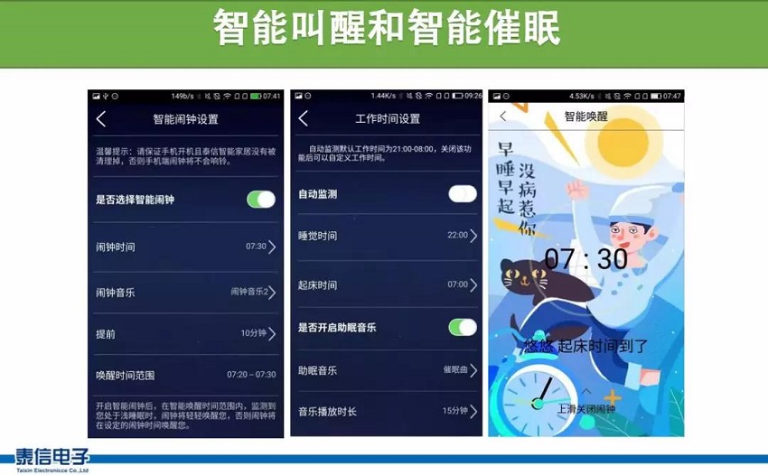 T70的智能音響功能與睡享健康結(jié)合,可實現(xiàn)智能催眠、智能叫醒等功能等。