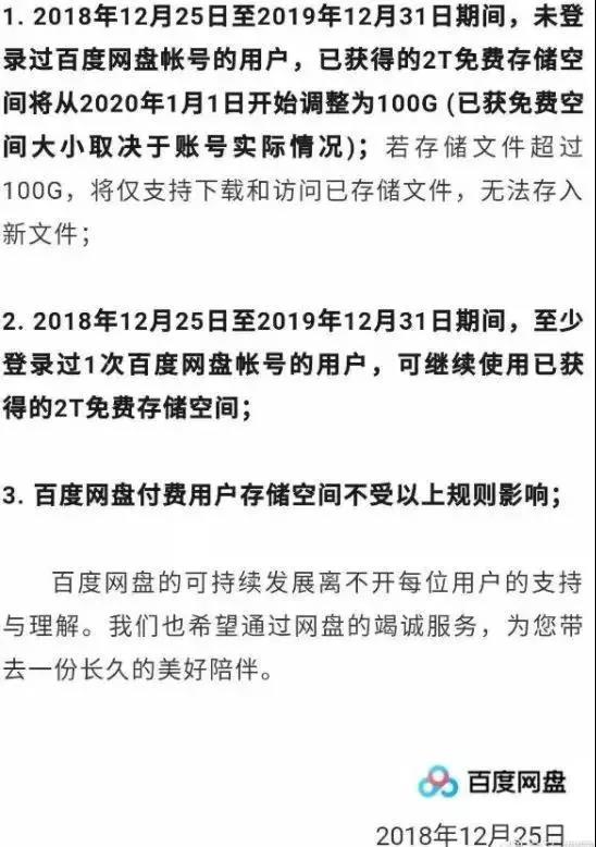 但不得不給你潑盆涼水:隨著網易云盤的關閉,免費的網盤就剩百度云盤一家了,而且從明年1月1號開始縮減免費使用空間。原因是網盤服務的成本很高,大量的服務器耗電、寬帶成本支出讓百度網盤每年虧損20億!