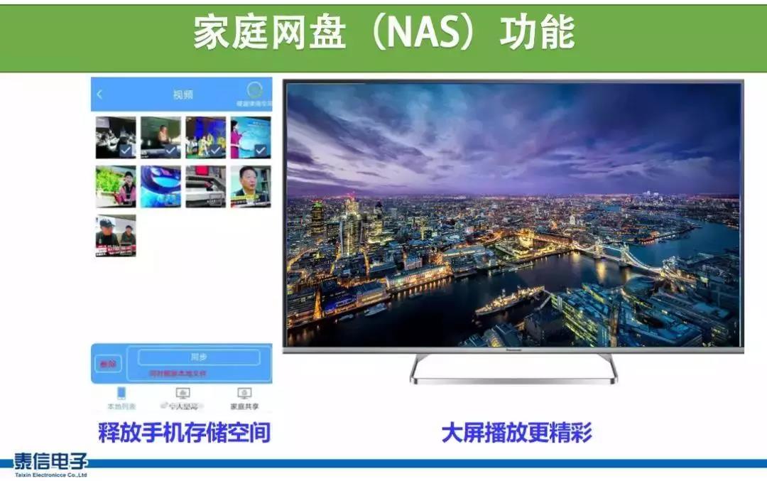 【泰信T6K智能家庭音箱】連接USB硬盤還能實現NAS功能,手機軟件端控制,可以給手機設定數據自動備份,也可以在電視上直接播放硬盤里的照片、音視頻等內容。相比網絡云盤,速度更快,私密性更好,很實用的功能。