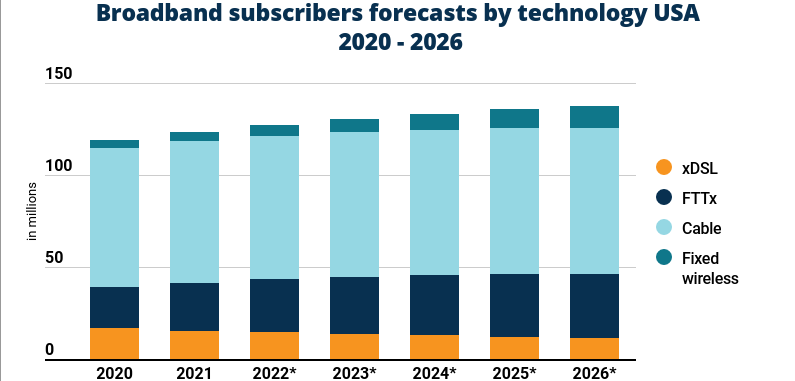據預測,美國有線電視寬帶在相當長的時間內仍是主流。而傳統電信光纖寬帶由于存在煙囪式的設備捆綁,通用化和市場化困難,主要由運營商定制,升級速度和產業分工效率反而慢于有線電視。